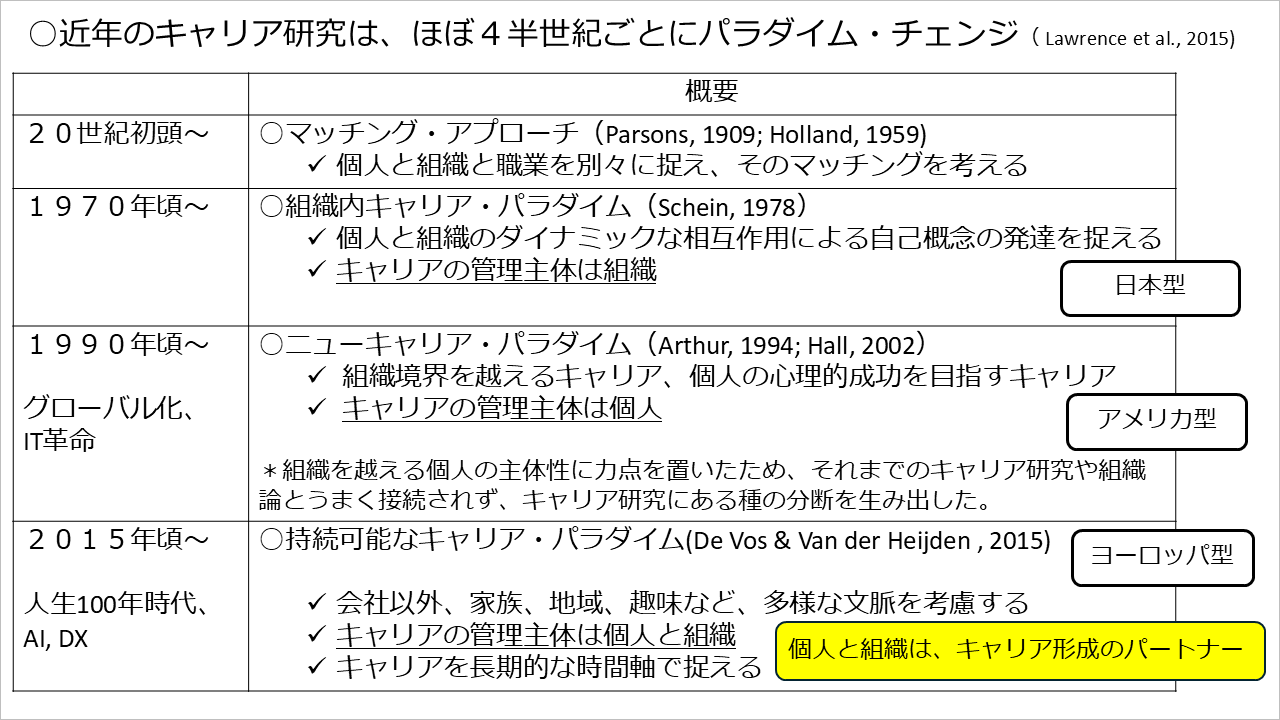 キャリアのパラダイムは2025年おきに大きく変わると言われています。いわゆるキャリア研究という分野が本格的に登場する以前は、個人と組織の相性を考えるマッチングアプローチが中心でした。その後、1970年代にエド・シャインなどの理論が登場し、組織内キャリア・パラダイムを中心とした本格的なキャリア研究が始まります。キャリアの管理主体は組織の側にあり、個人と組織のダイナミックな相互作用によって、自己概念をどのように発達させていくかを考えるのがこの組織内キャリア・パラダイムであり、現在でも日本でキャリアを考える場合には、主流のものの見方だと言えます。