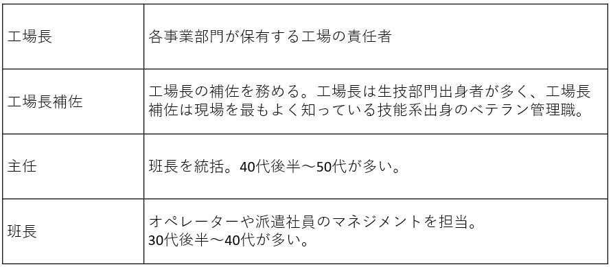 鈴鹿製作所は、4つの事業部に分かれていて、それぞれ作っている製品が違います。それぞれの工場のトップが工場長補佐で、現場を最もよく知っています。