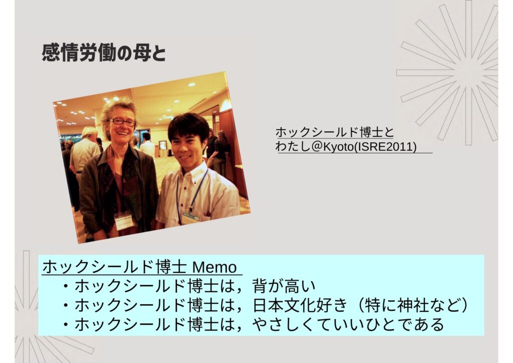 Q2: 私は、ご著書(「あなたの仕事、感情労働ですよね?」)を拝見して衝撃を受けたのですが、そもそも関谷先生がこの「感情労働」に着目された動機はどのようなものでしたか?