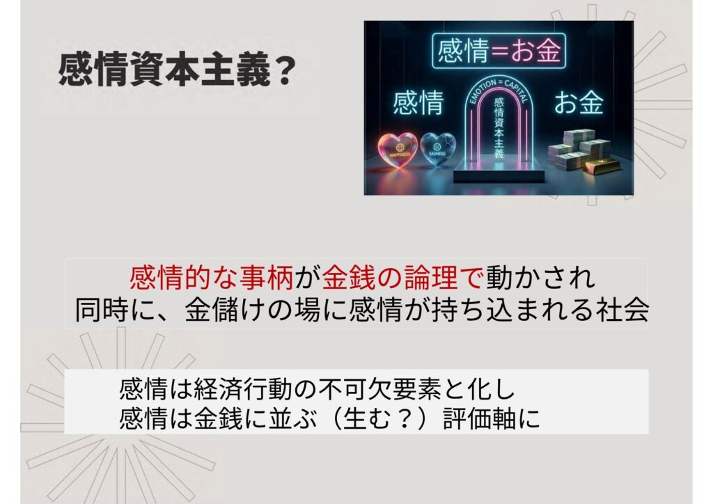 関谷:2007年頃に、エヴァ・イルーズという社会学者感情労働の概念を広げて「感情資本主義(エモーショナルキャピタリズム)」という概念を提唱しました。要するに、社会全般で感情が資本価値を持つようになっているという考え方です。例えば SNSや就活やマッチングアプリで何が価値として認められるかというと、それはもう感情ですよね。 EQ が高い人が市場の中で勝ち、感情経験を提供できる会社が儲かって、感情というものが社会の中で取引されて、場合によると資本家に搾取されている、という問題提起です。